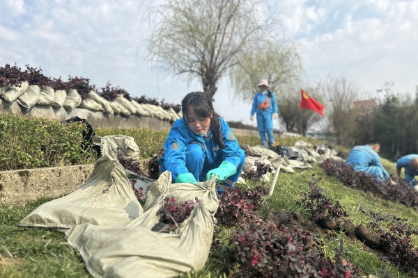 看,这边正挥舞着铁锹铲土,干劲十足;看,那边正搬运着苗木,忙得不亦乐乎;看,他们正提水灌溉,场面热火朝天。